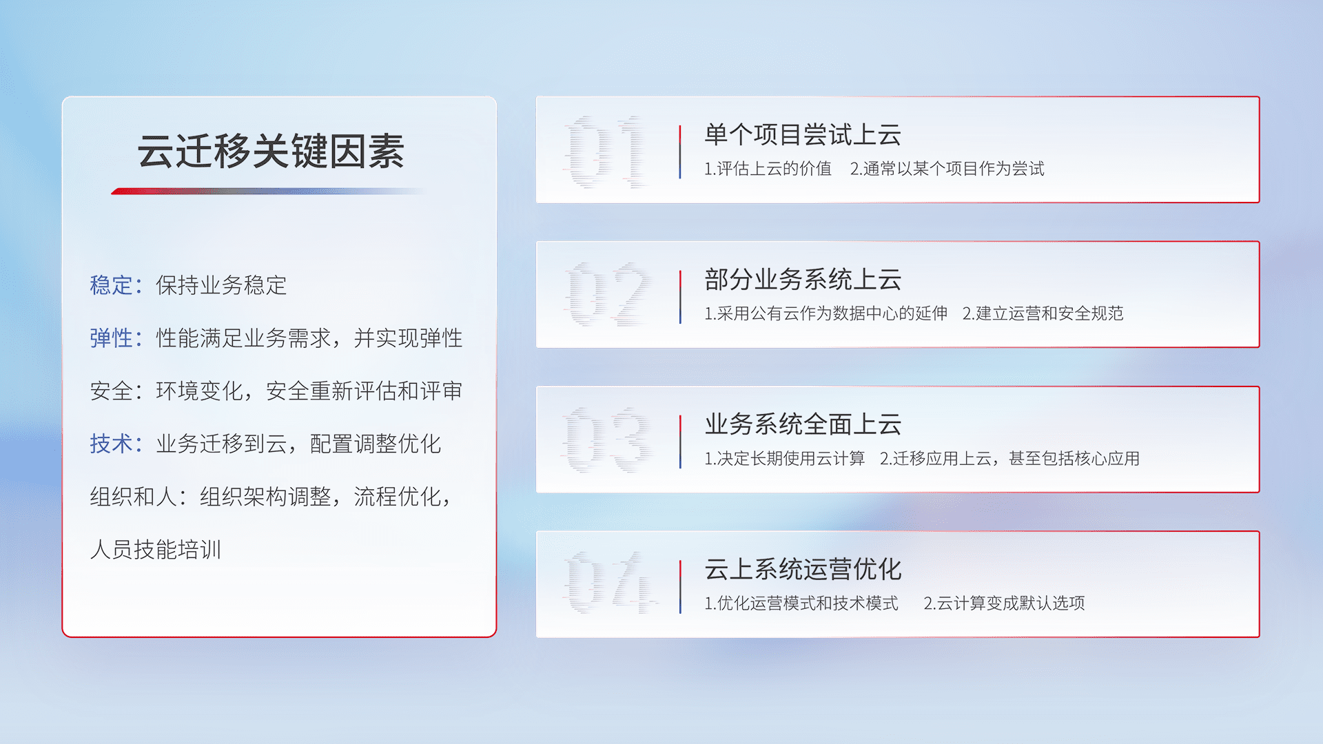 结合实际业务,,,,从规划设计、、云平台选型、、、云原生改造、、数据迁移、、集成交付,,,,迁移全过程为客户识别最佳上云路径,,,做好风险识别管理,,,,设计网络架构、、、、身份权限、、安全审计合规、、操作审计、、日志审计、、监控告警策略、、、、多站点容灾设计等,,,对云上基础设施进行整体规划,,,提升IT治理水平,,,,以满足弹性、、高可用、、高性能的需求。。。