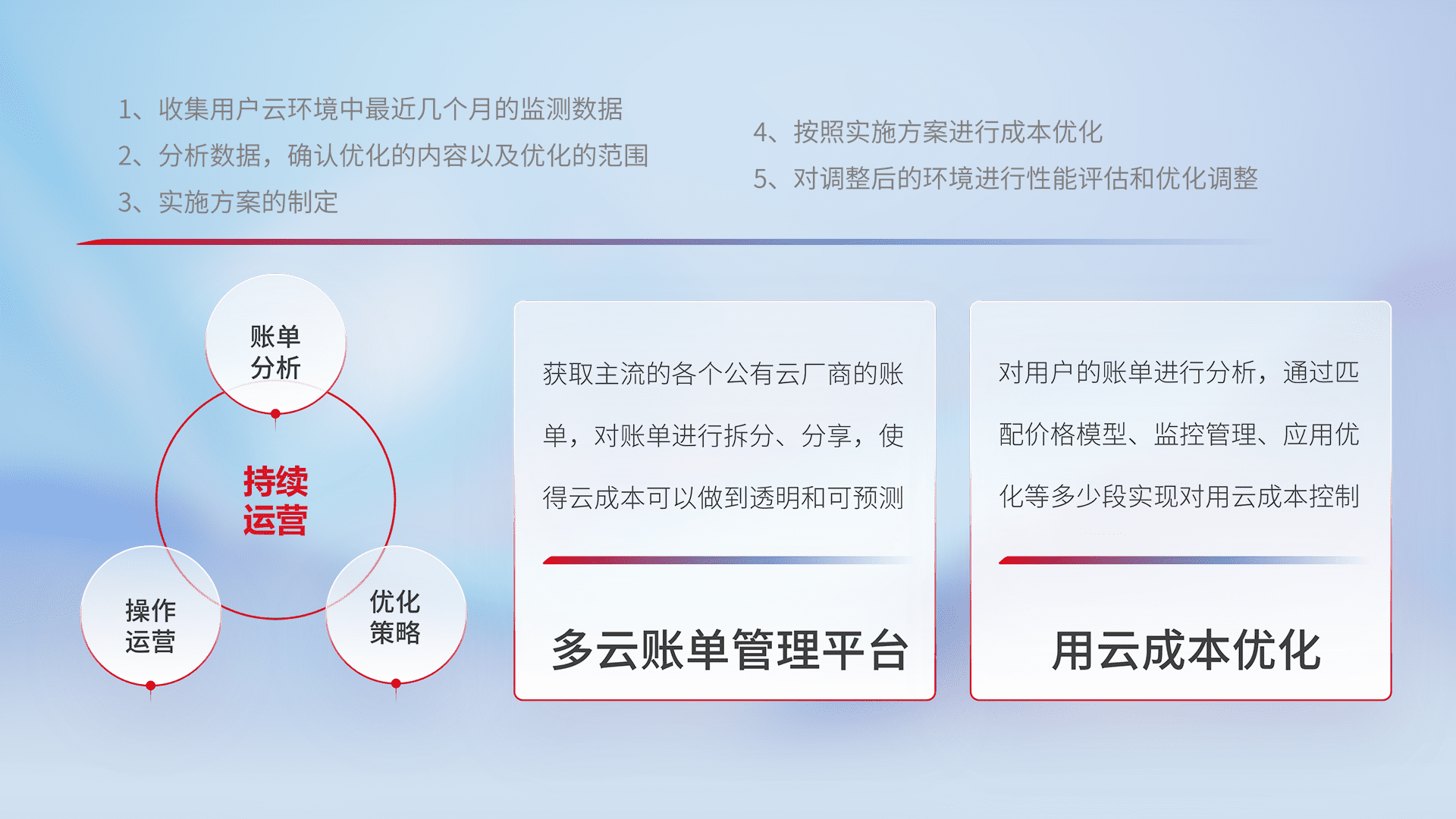 通过多云纳管,,,,以统一的资源数据模型把客户的云资源进行抽象和封装,,,进而实现对多云资源的统一操作,,保障云资源管理的可靠性、、、、稳定性与可用性。。。量身定制化运维内容,,,,配置、、、、开发运维、、、补丁管理、、、备份、、、、监控、、认证和访问管理、、审计和日常巡检等,,保障在用云过程中的可靠度,,稳定度以及高可用率。。。