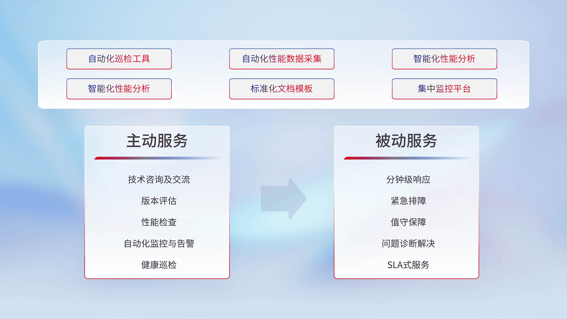 智能化工具和标准化文档,,,保障服务质量,,,,提供主动服务(包含技术咨询、、、、版本评估、、、、性能检查、、、自动化监控与告警、、、、健康巡检)和被动服务包含(分钟级响应、、、紧急排障、、、值守保障、、、、问题诊断解决、、、、SLA服务)。。。。